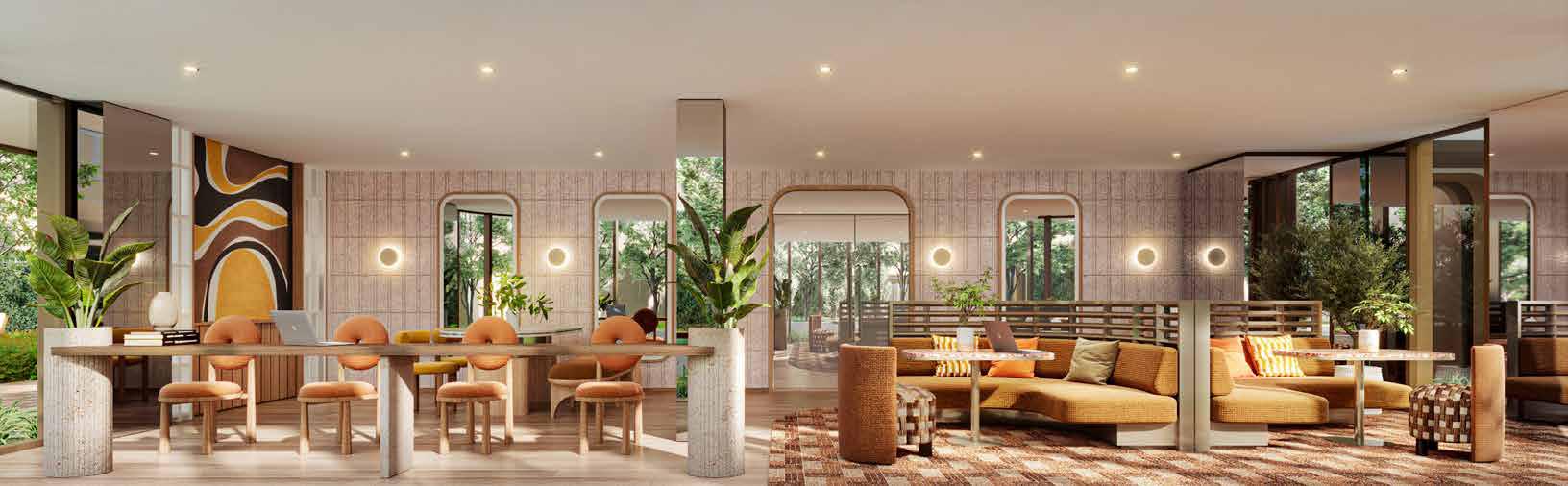 A peaceful working space maximizes your creativity with multiple seating functions whether to sit alone or work in a group. It's all there. With unique curved furniture, skylights, and other materials, it fosters a harmonious feeling of nature and softness helps to reduce stress and anxiety. Plus, an uplifting sensation with a bright yellow tone is added so you can perceive a positive energy all day while working and admiring the garden view.