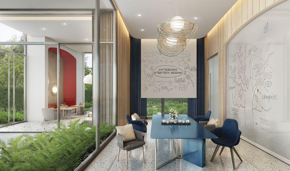 ENERGISE THE WAY YOU WORK WITH A GARDEN-SIDE MEETING ROOM DESIGNED WITH VERTICAL LINES THAT CONNECT THE WAY YOU THINK AND INCREASE YOUR ABILITY TO DEVELOP, COMPLEMENTED BY CONTRASTING COLOURS BETWEEN THE TWO ROOMS TO STIMULATE YOUR CREATIVITY