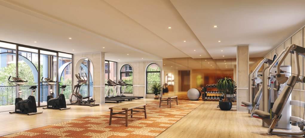 A space to keep you Fit & Active while maintaining cool coastal vibes. Wood floors exude comfort, while the bright orange carpet bursts with fun and exciting energy in the vibrant Fitness Centre.