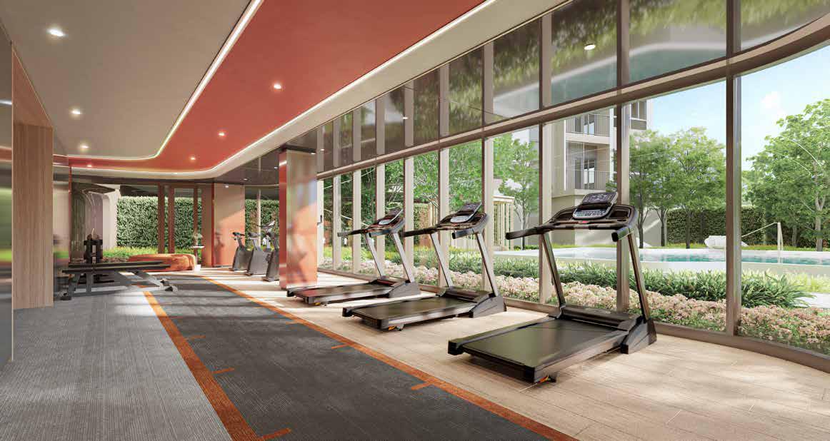 A perfect space for gym rats with complete functioning equipment for cardio and weight training is furnished with an orange tone and wooden texture to boost energetic vibes. Large glass windows are opted for sightseeing nature in panoramic view give a feeling like running and exercising in a beautiful garden.