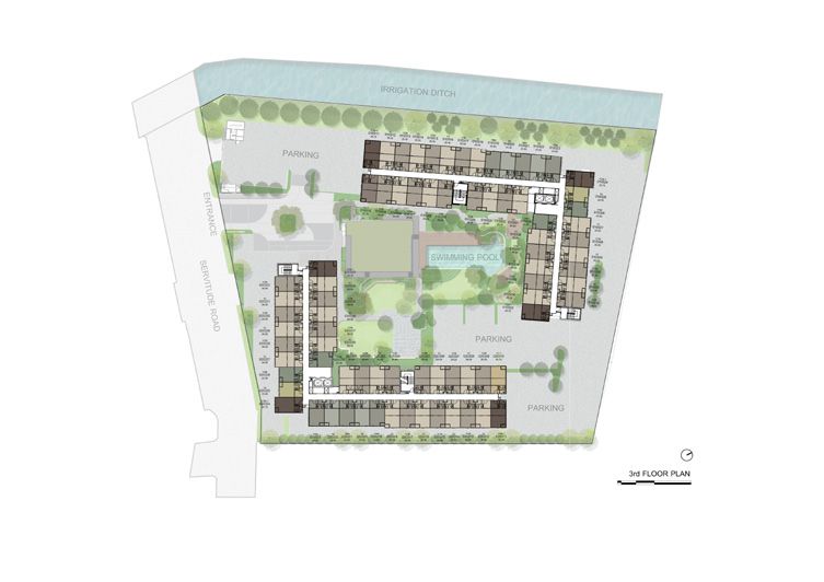 After a long day of work and activities, unwind by the serene pool that stretches through the heart of the project. Whether you're in the mood for a serious swim, a relaxing dip, or just chilling by the water, there's space for you to fully recharge in a peaceful, green setting.