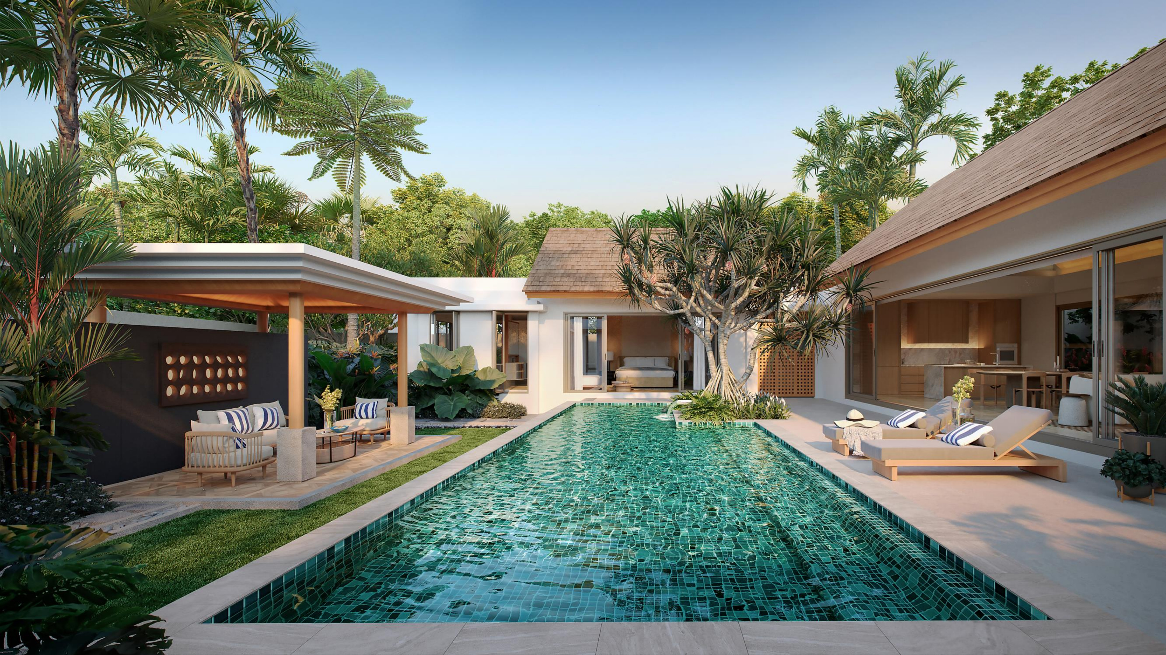 Water flows naturally around you, drawing you into a landscape designed as a Secret Lagoon hidden among lush islands. Communal gardens embrace the expansive pool, enveloping you in an atmosphere of quiet calm, privacy, and endless relaxation.